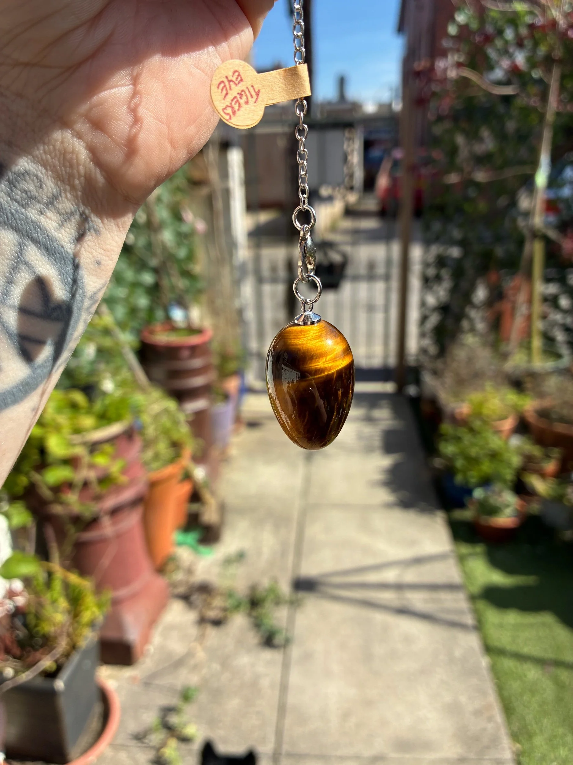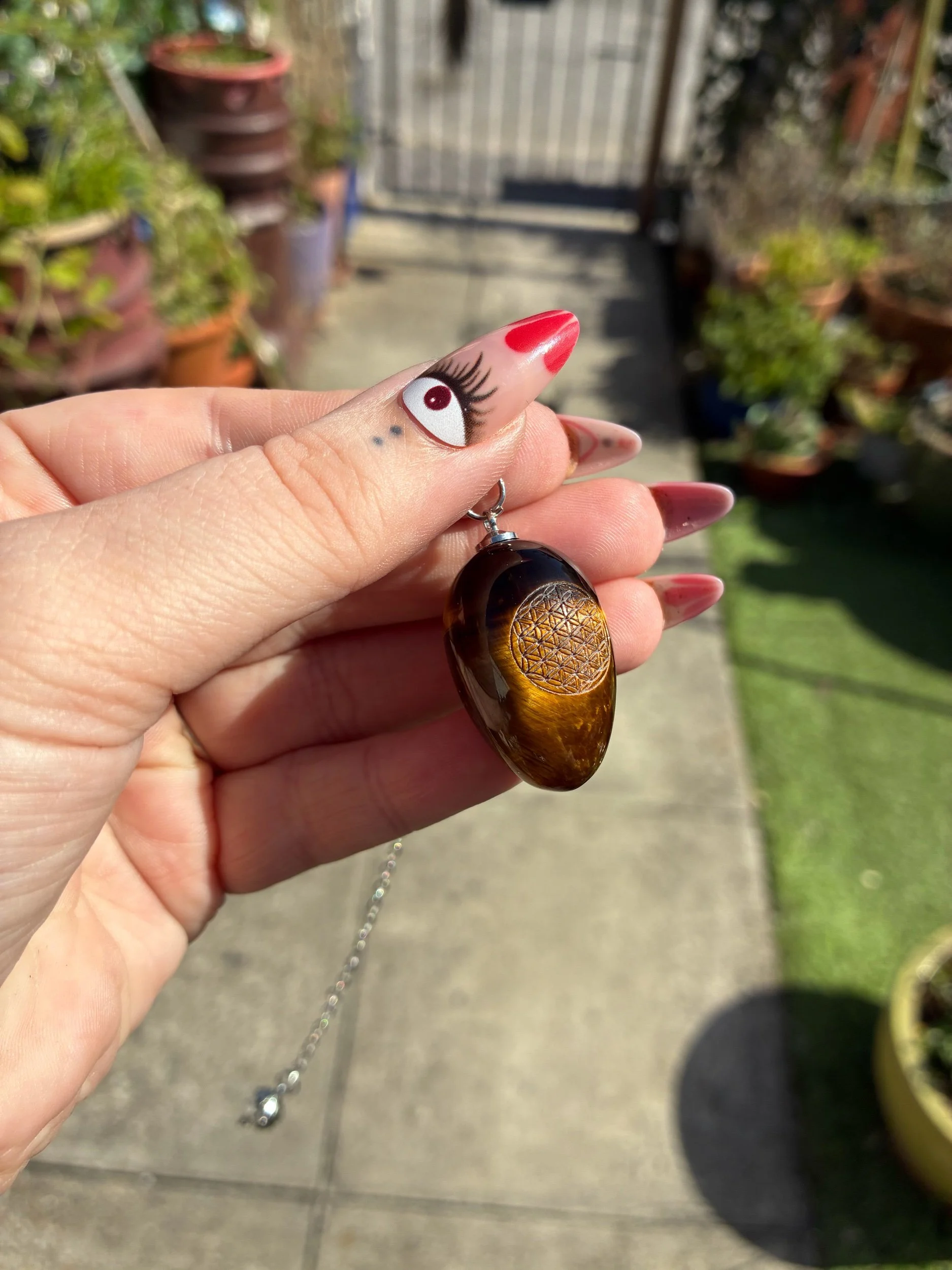 Tigers Eye Egg Pendulum with Flower Of Life Carving