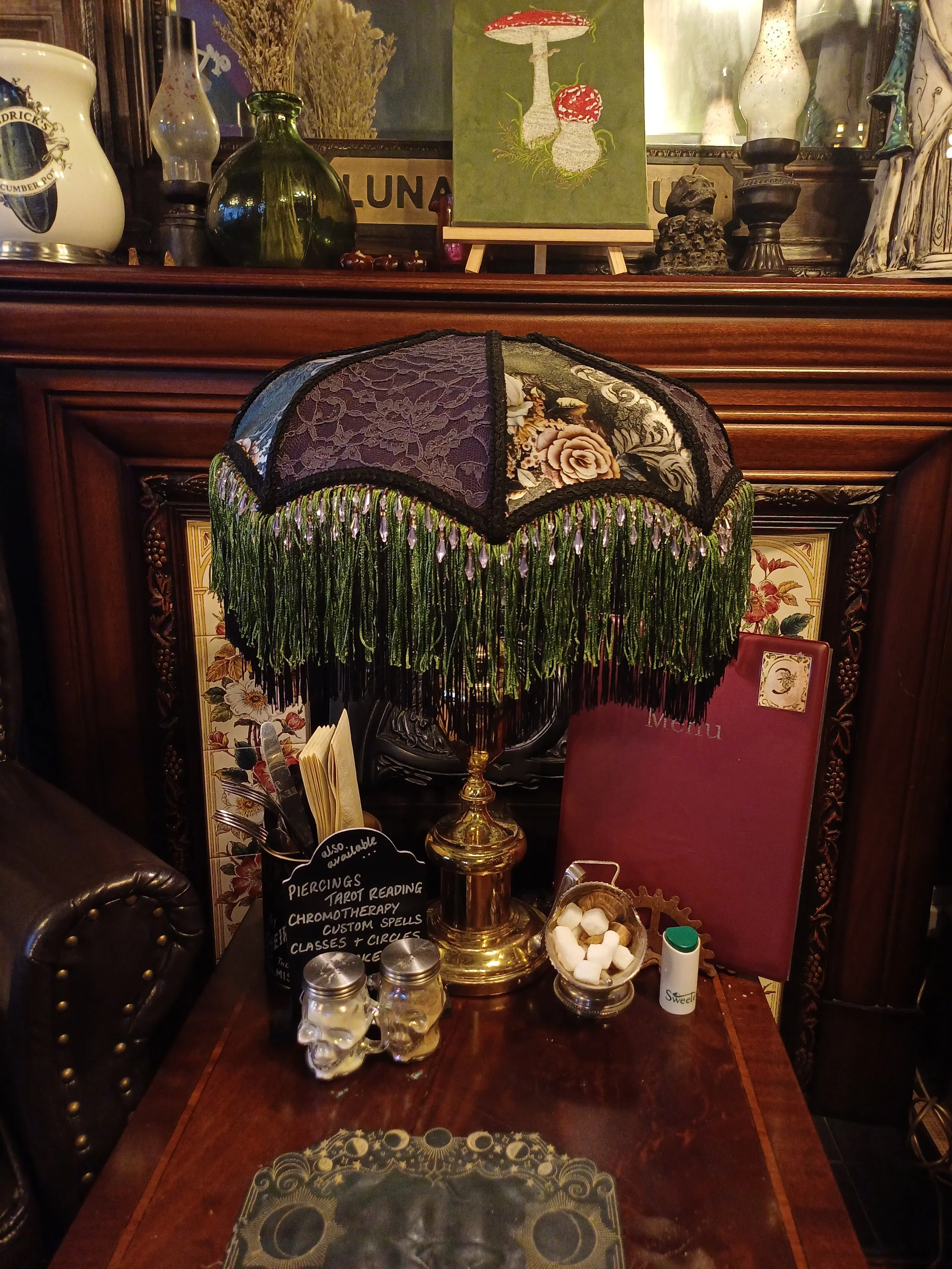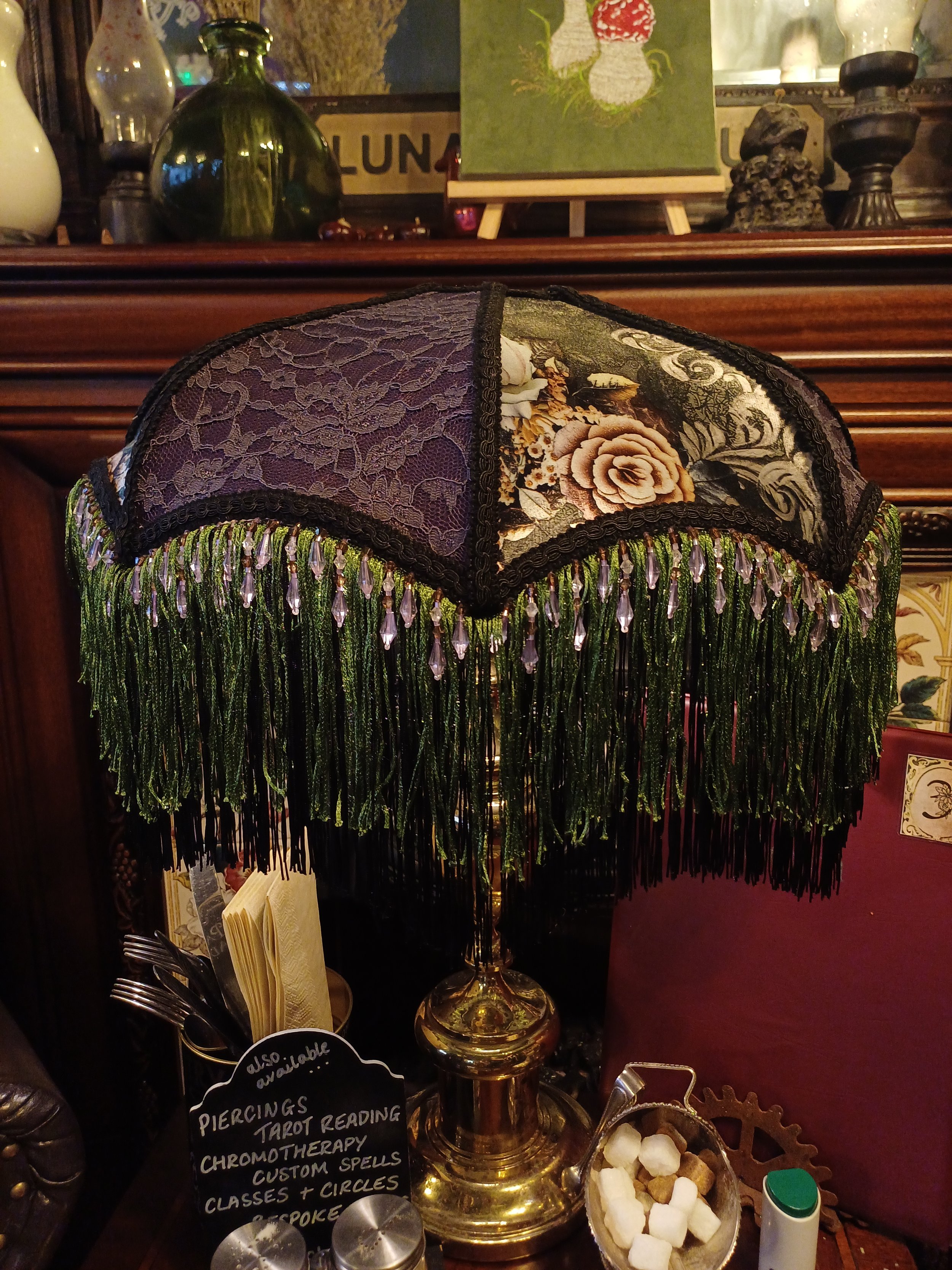 This is Nyx, she's a gorgeous purple and green lamp with purple lave and green floral velvet. She's got black and green fringe with lilac beads